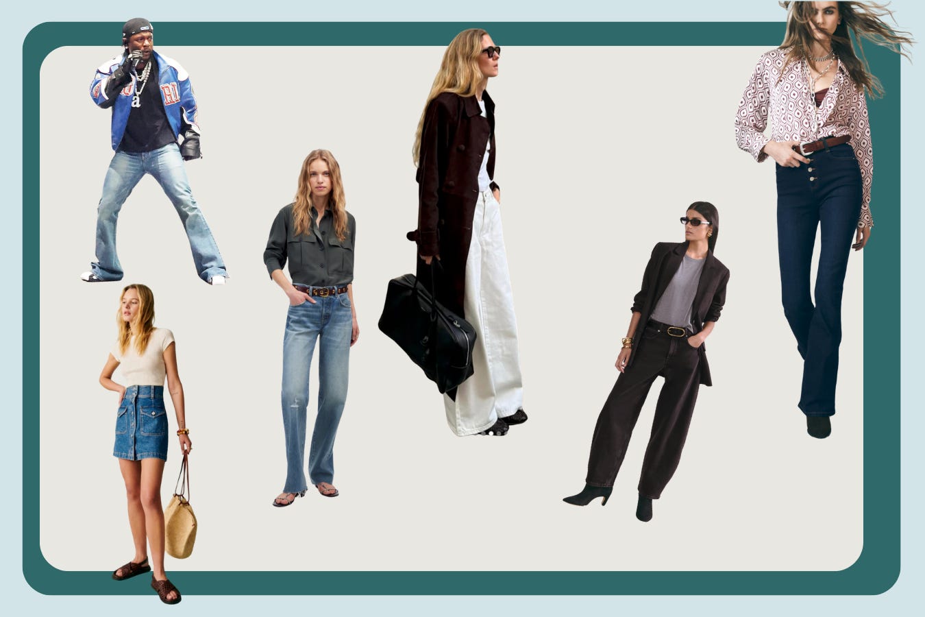 From top left counter clockwise: Kendrick Lamar in Celine at the Super Bowl Half Time Show, Madewell Straight Leg Jeans, White Jeans at Fashion Week, Barrel Jeans from Everlane, Flare Jeans from Zara, Denim Skirt from Sézane